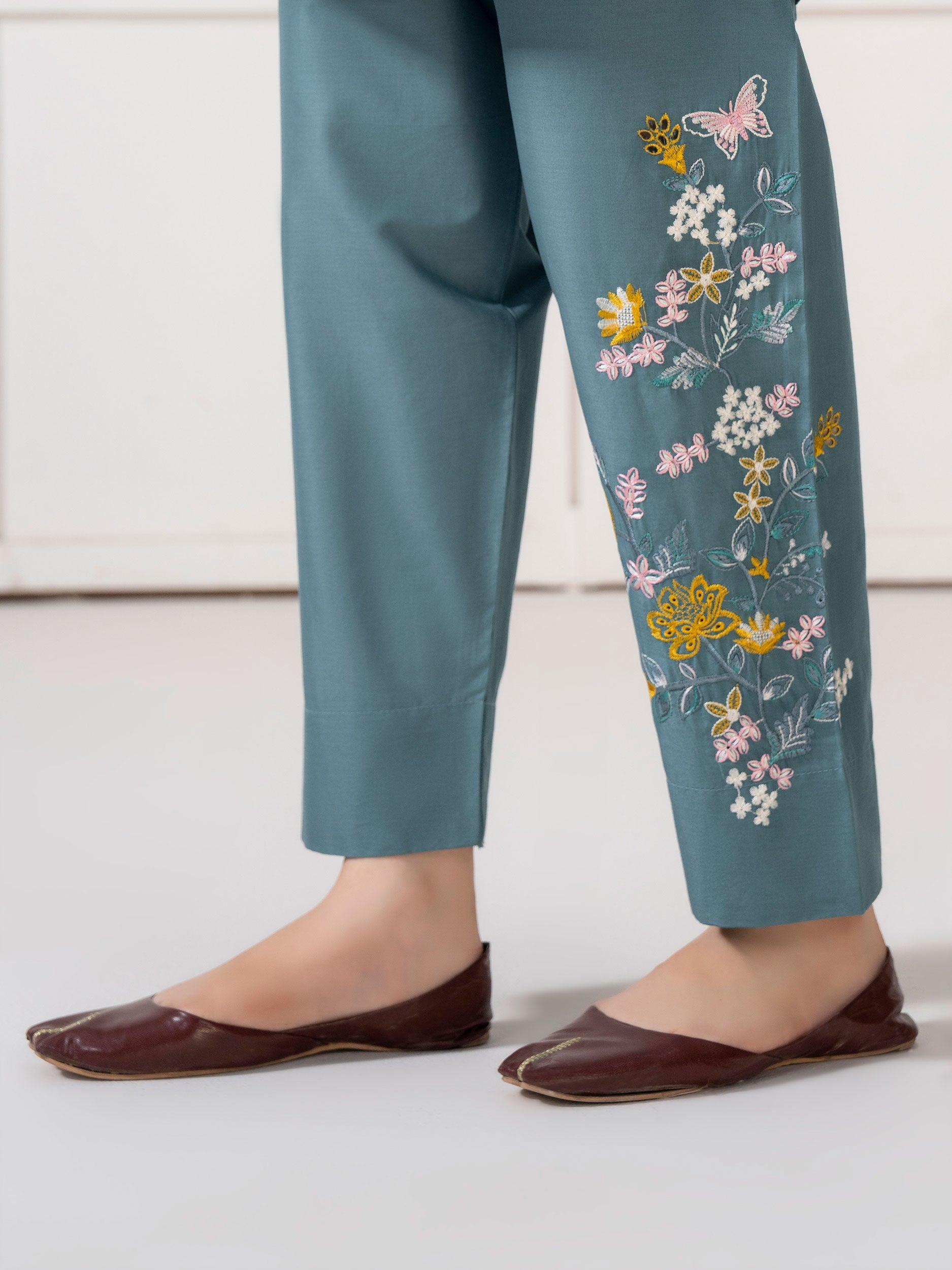 • Dyed embroidered narrow-leg trousers with elasticized waistband