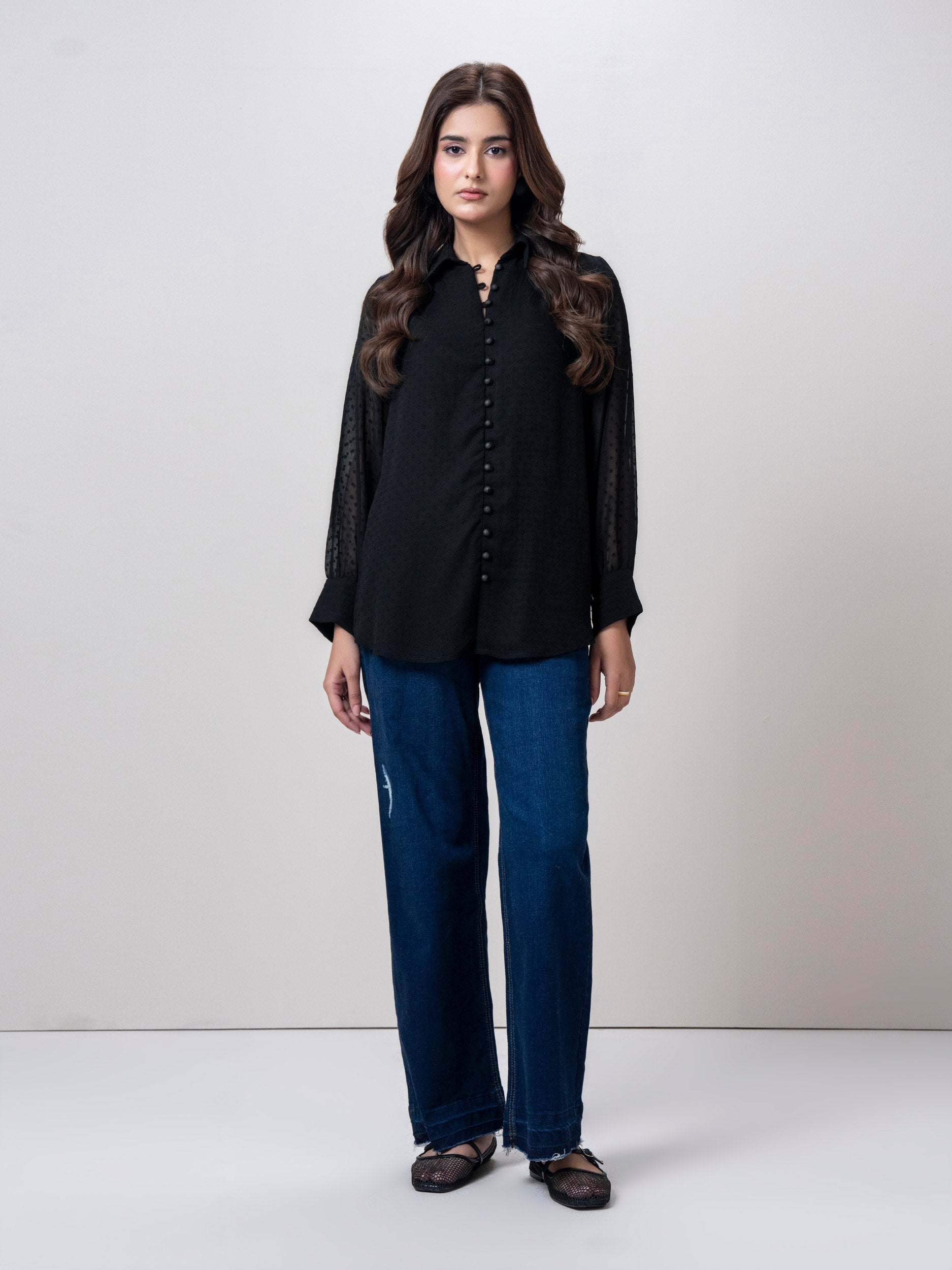 - Button-down top with cuff sleeves and inner lining