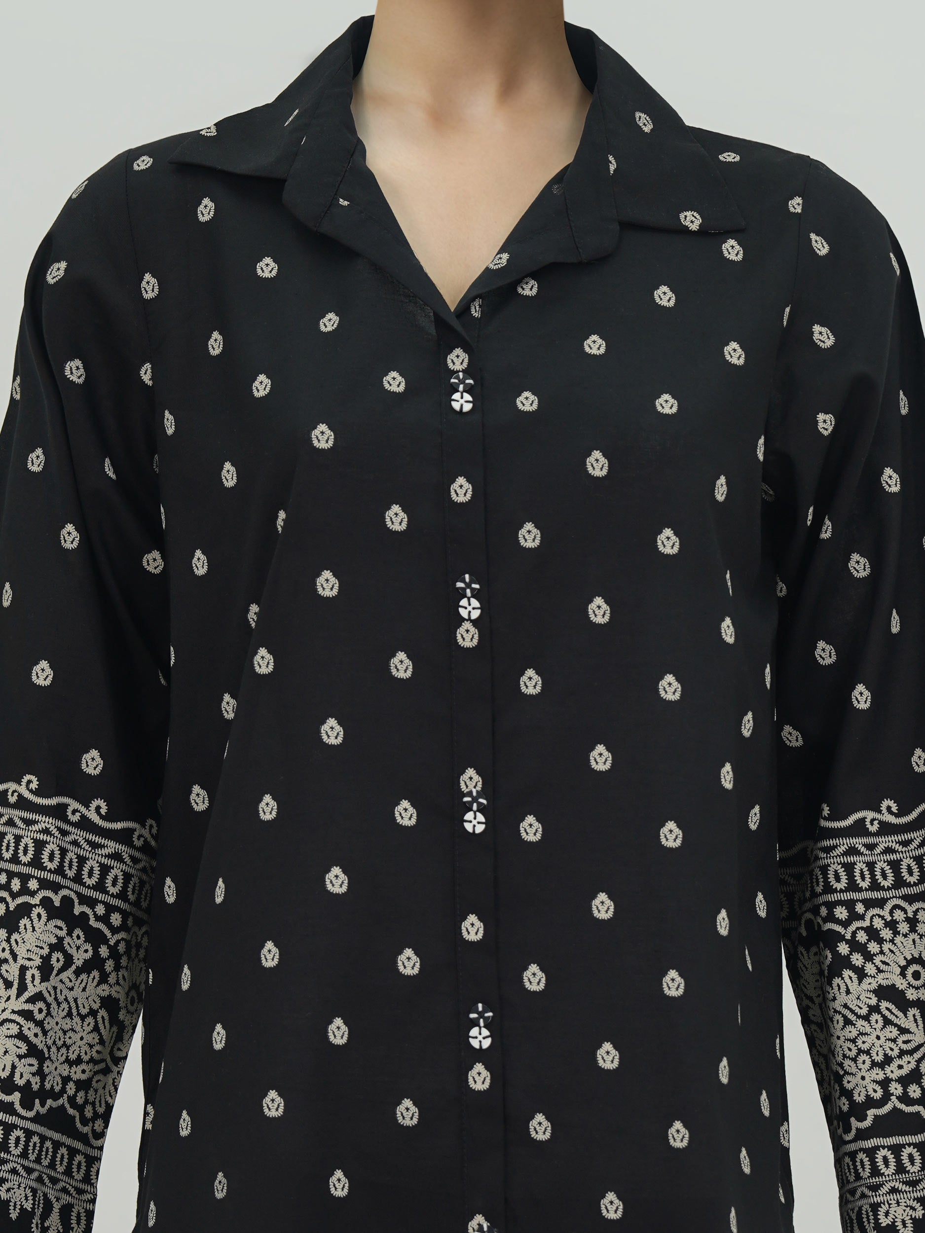 - Button-down printed top with collared neckline