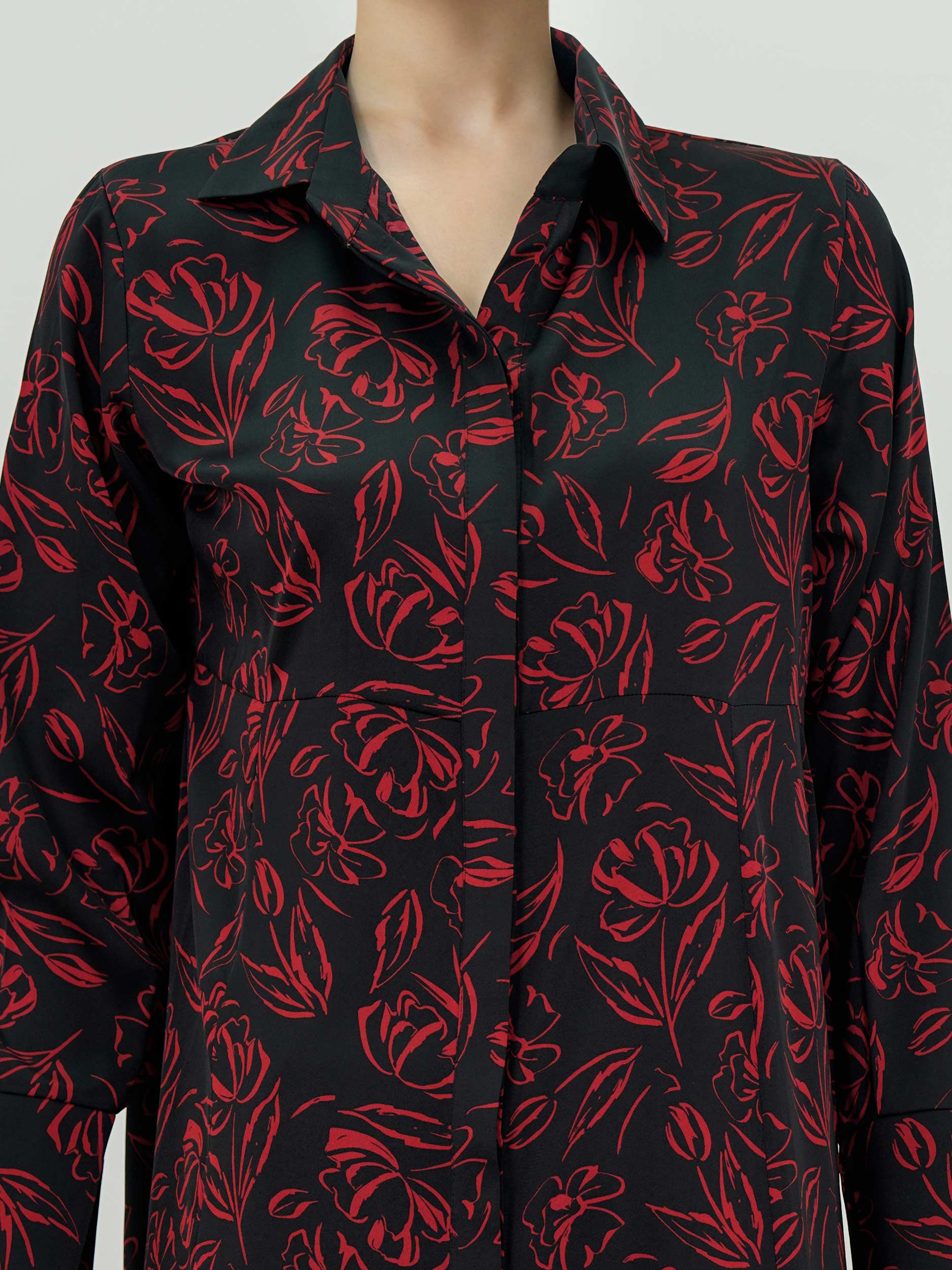 - Button-down printed tunic with collared neckline and cuff sleeves