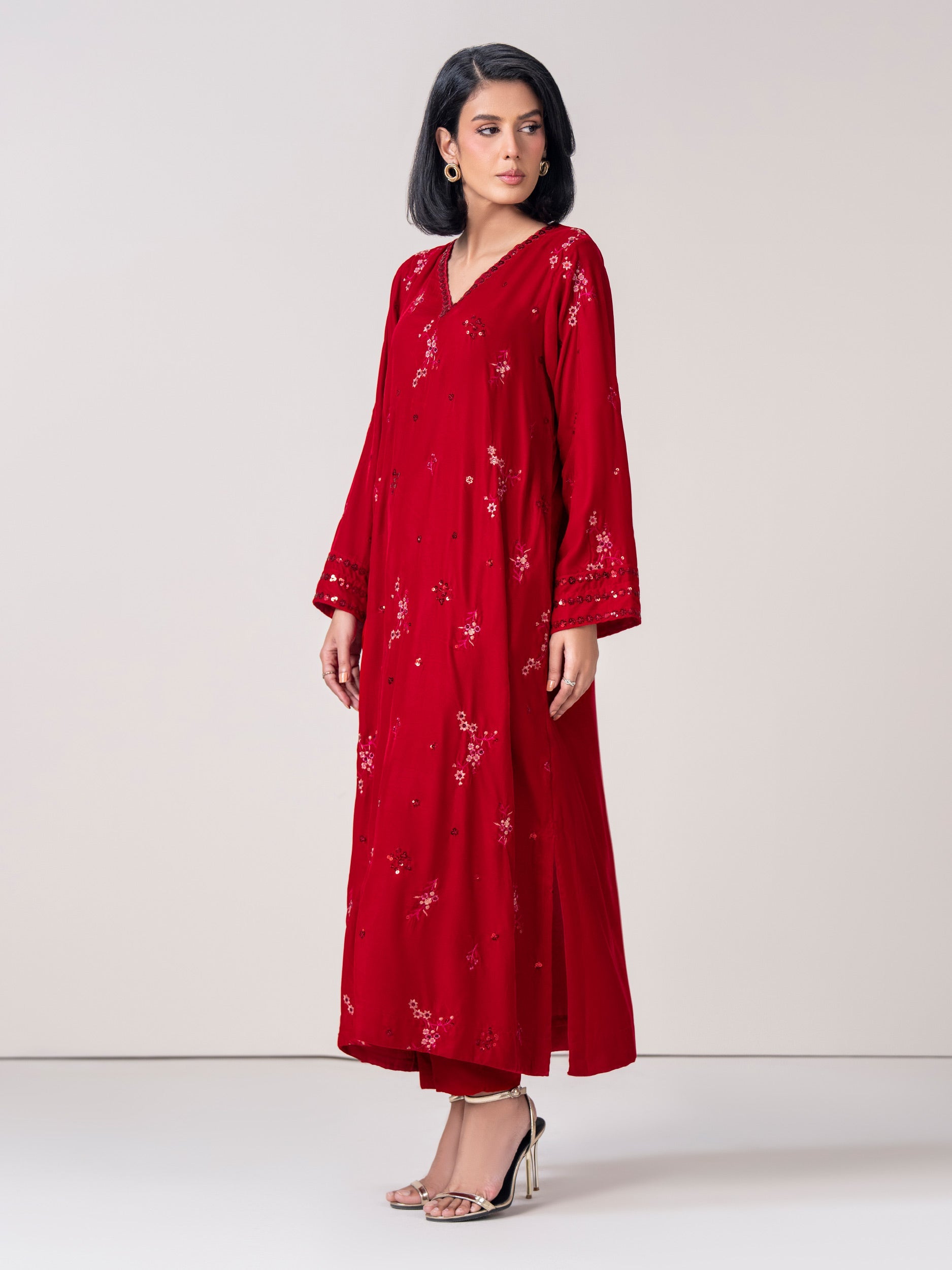 • A-line shirt with v-neckline, sequin and thread embroidery, and low slits