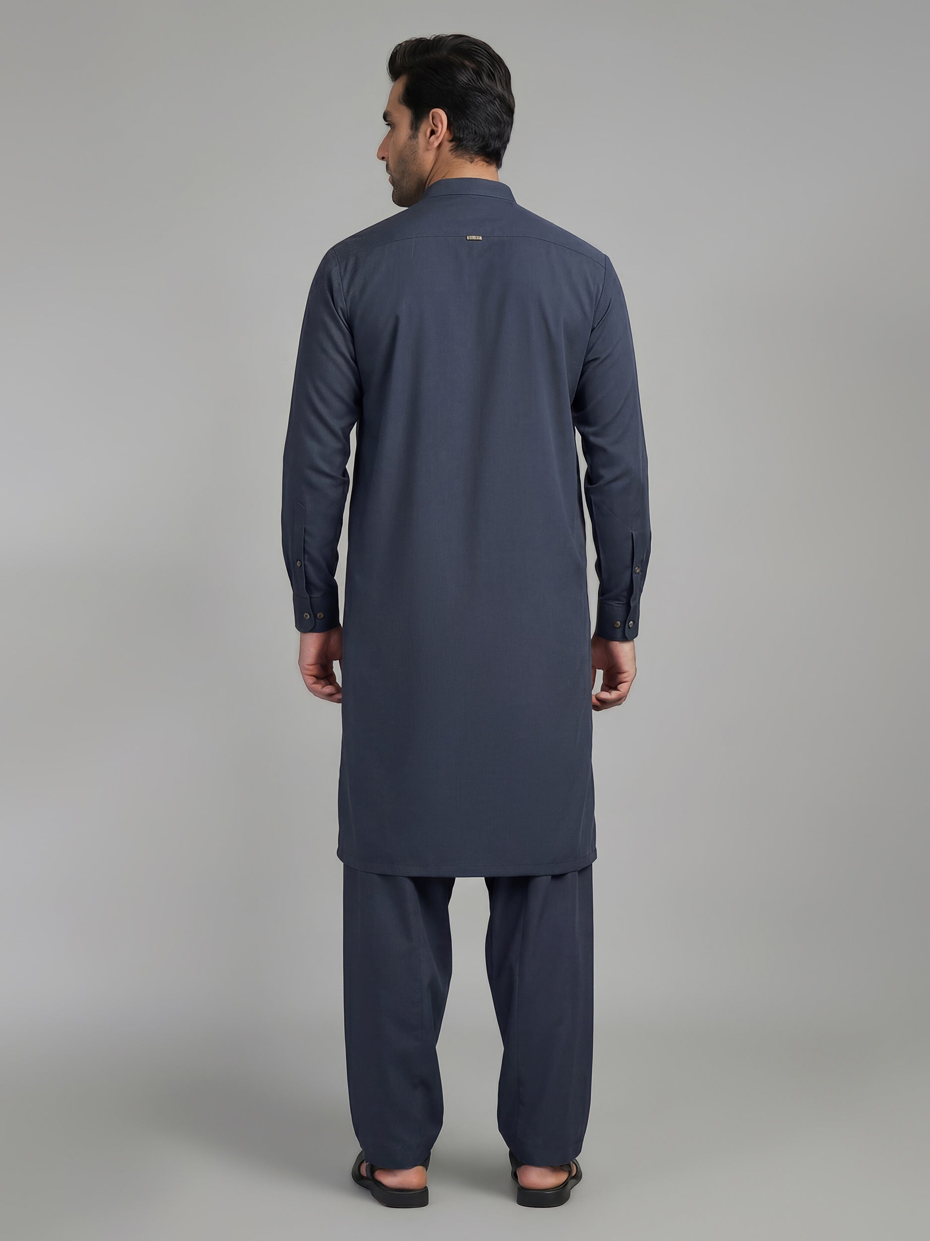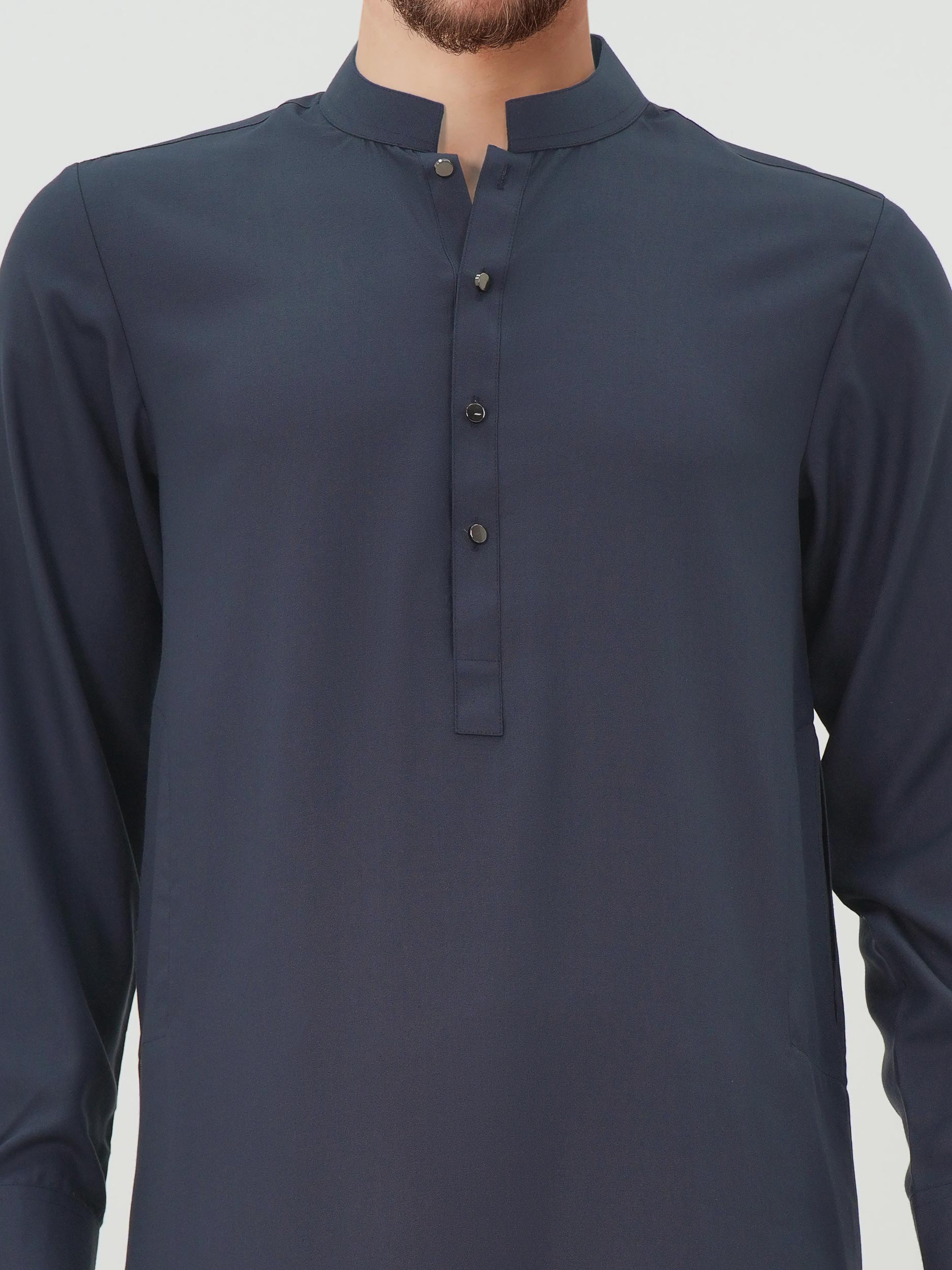 Straight-cut kurta with a button detailed placket, full cuffed sleeves, and two side pockets.
