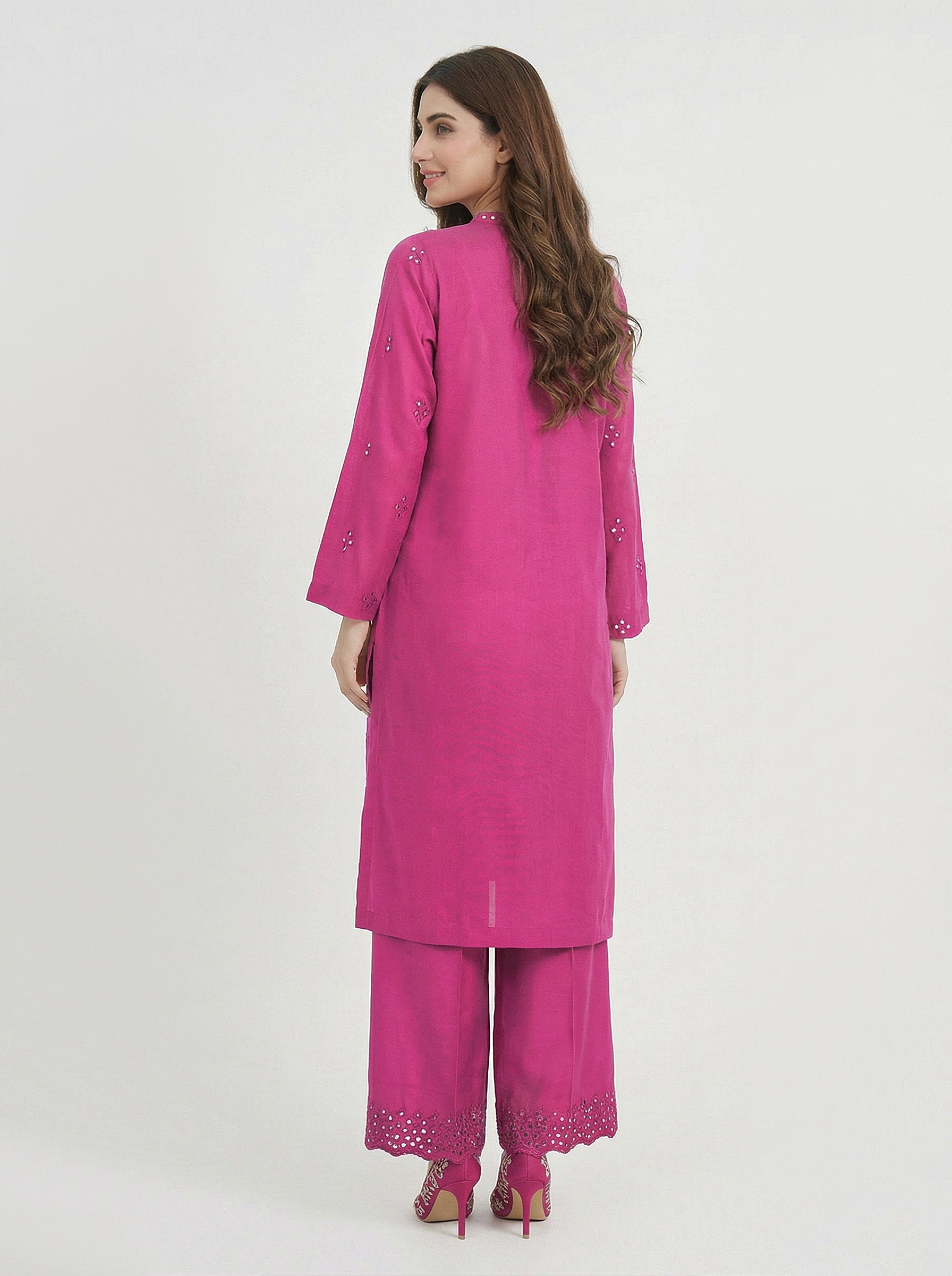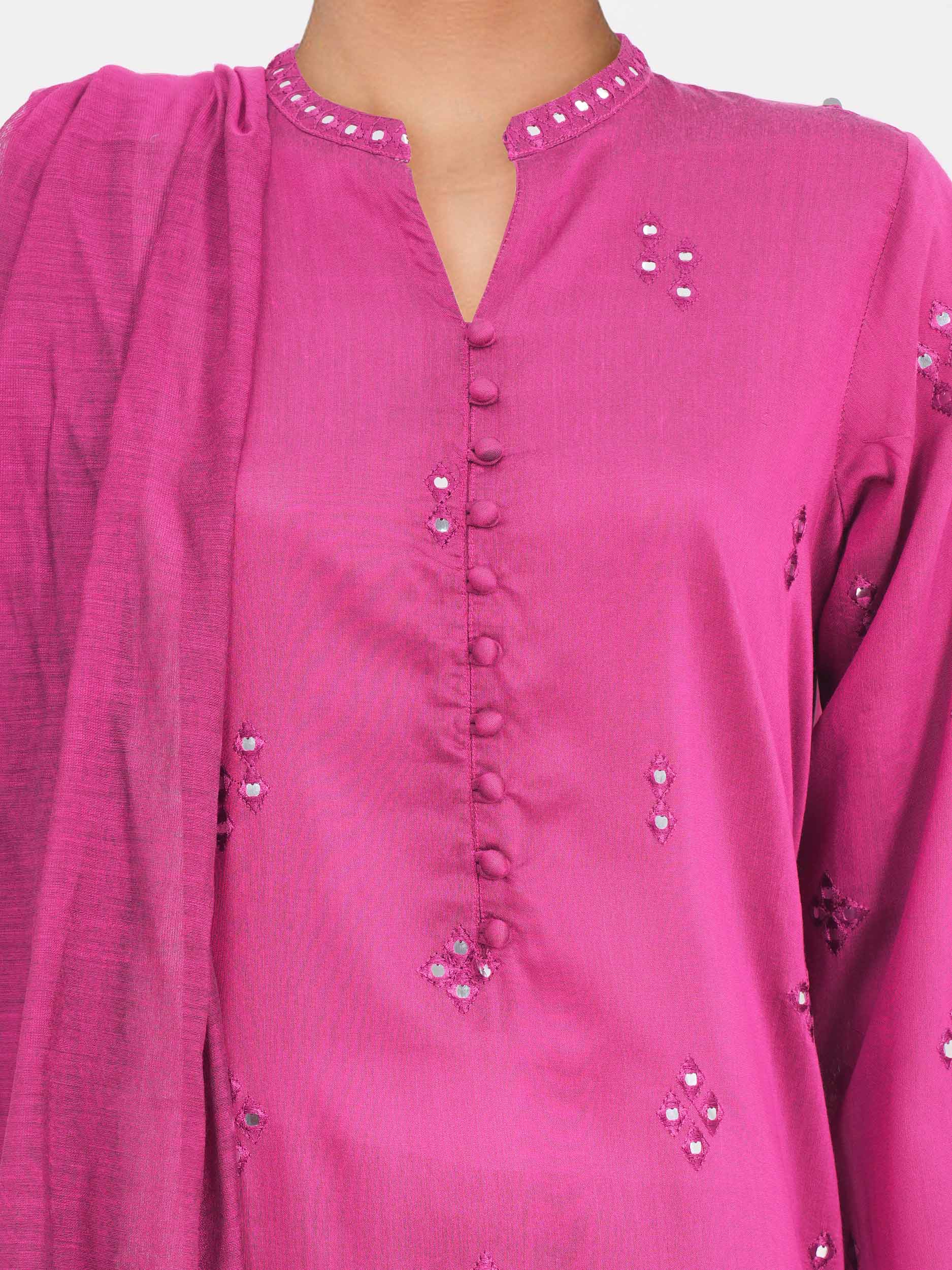 Mirror and tilla embroidered shirt with embellished button detailing and scalloped border hem