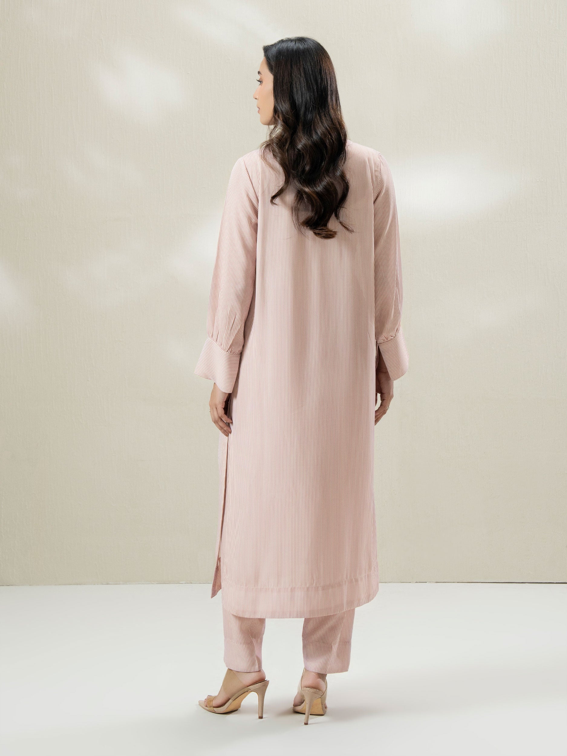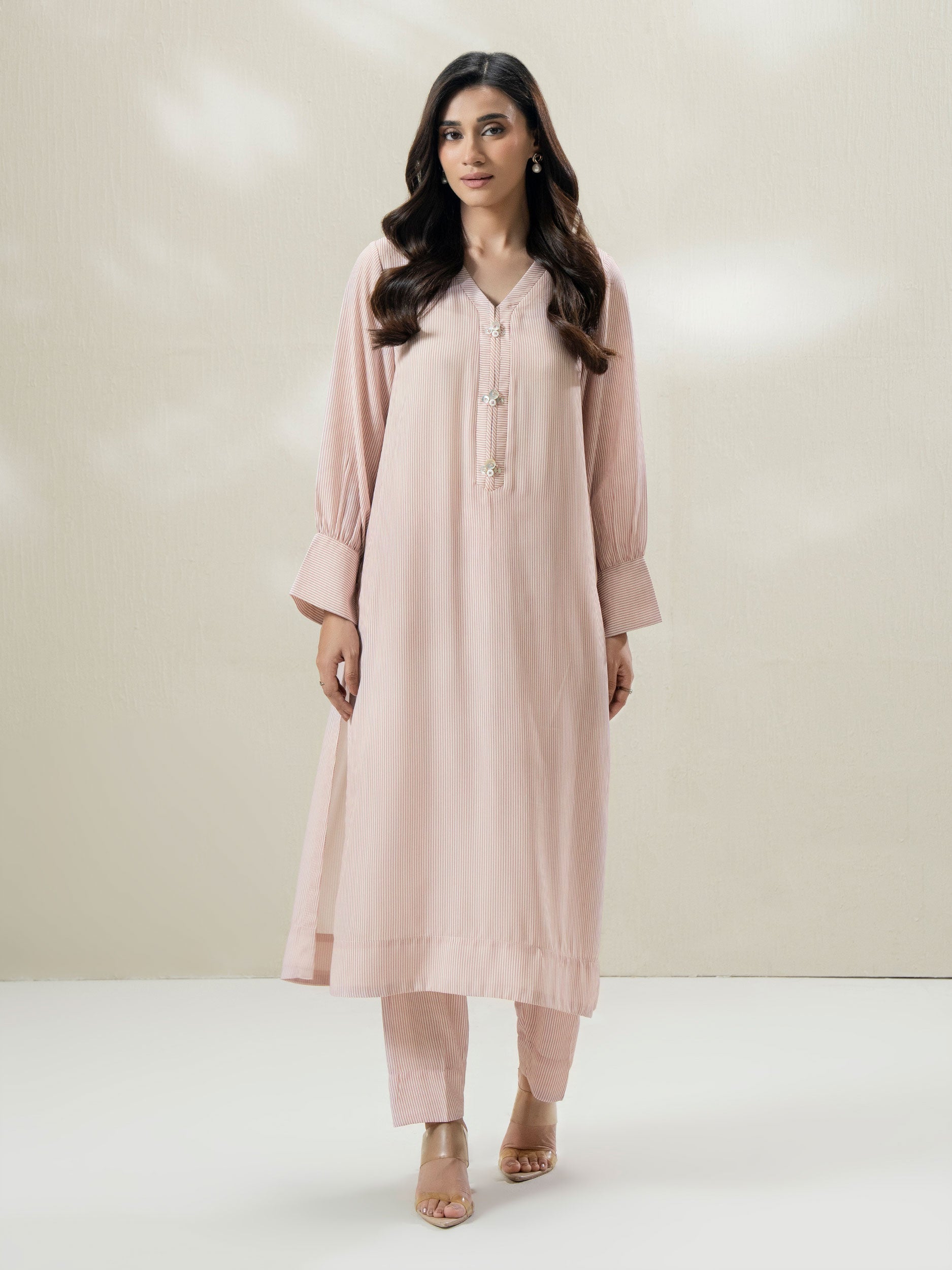 - Striped flowy loose-fit shirt, cuff sleeves with V neckline and detailing on