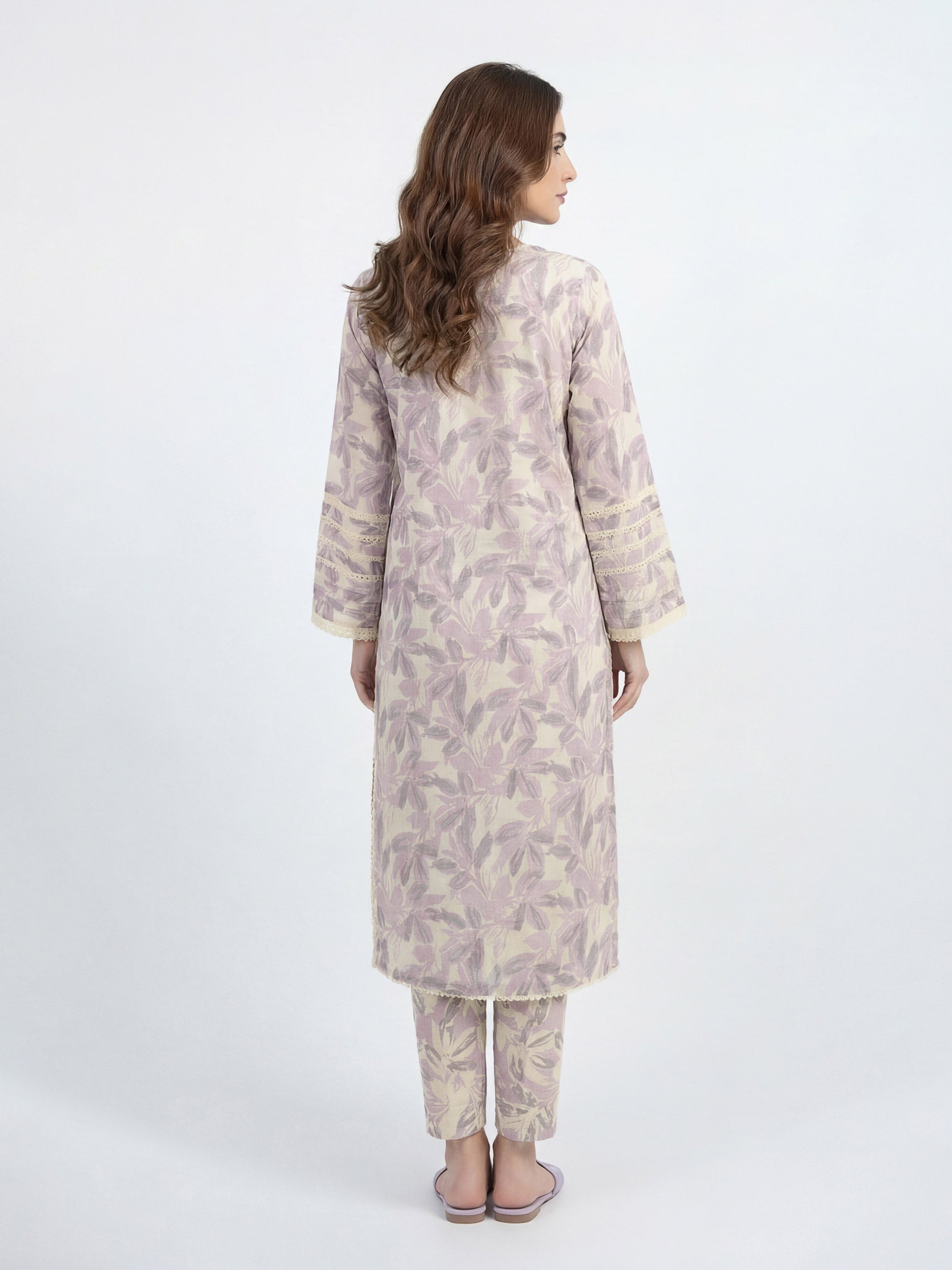 - Straight-cut printed shirt with a lace-detailed neckline and