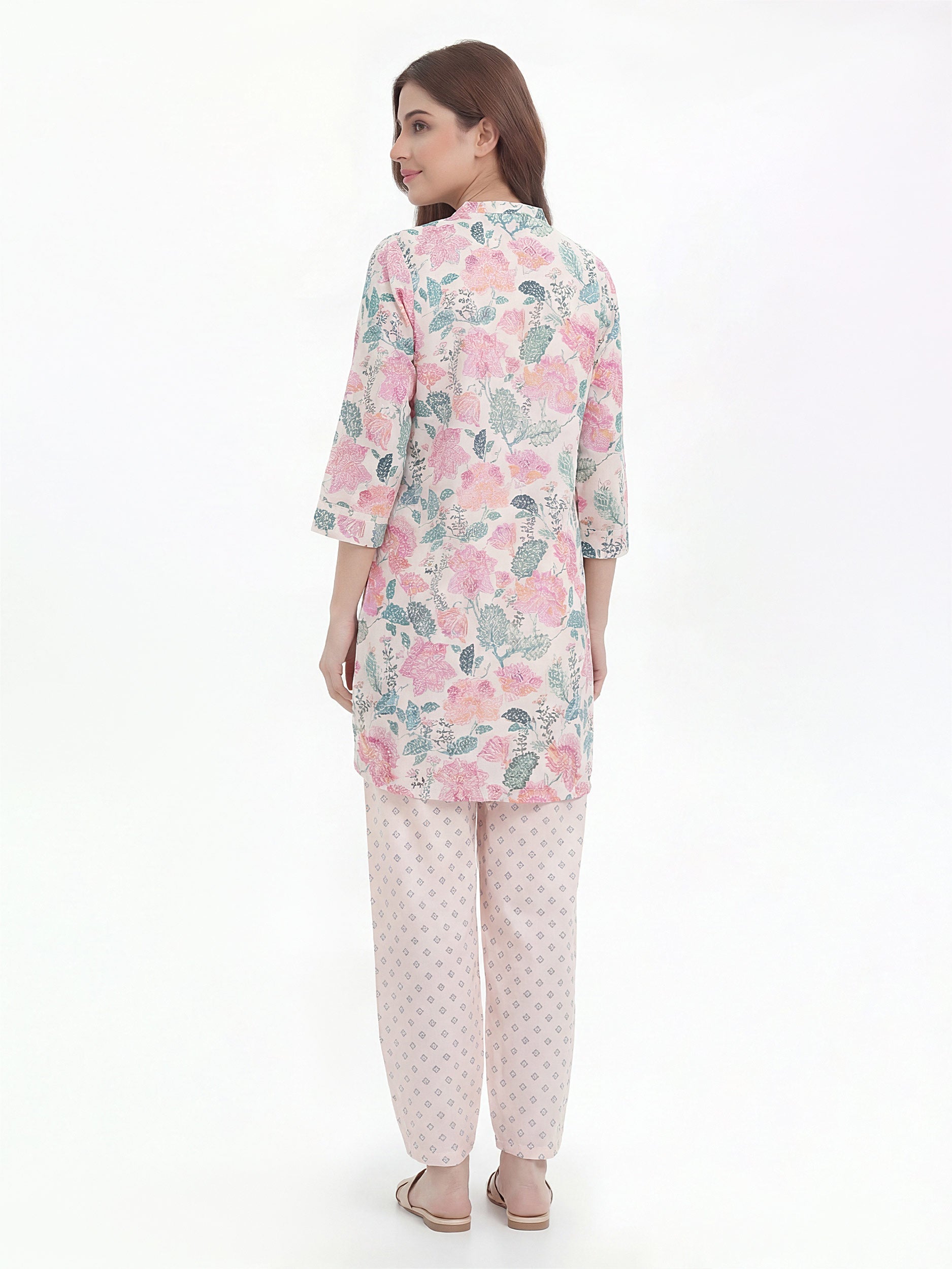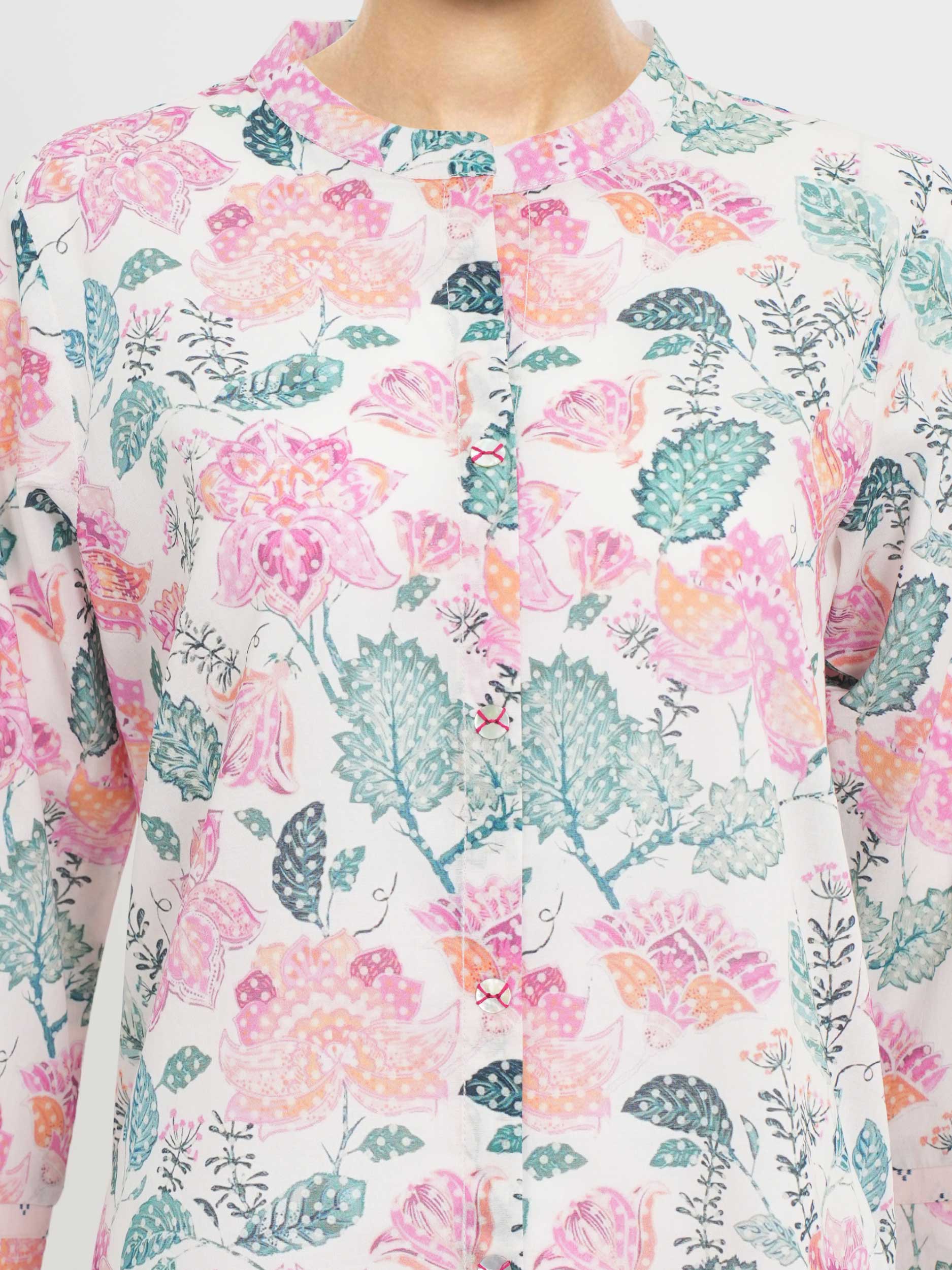 Printed button-down shirt with a band collar, button-down placket, and three-quarter sleeves