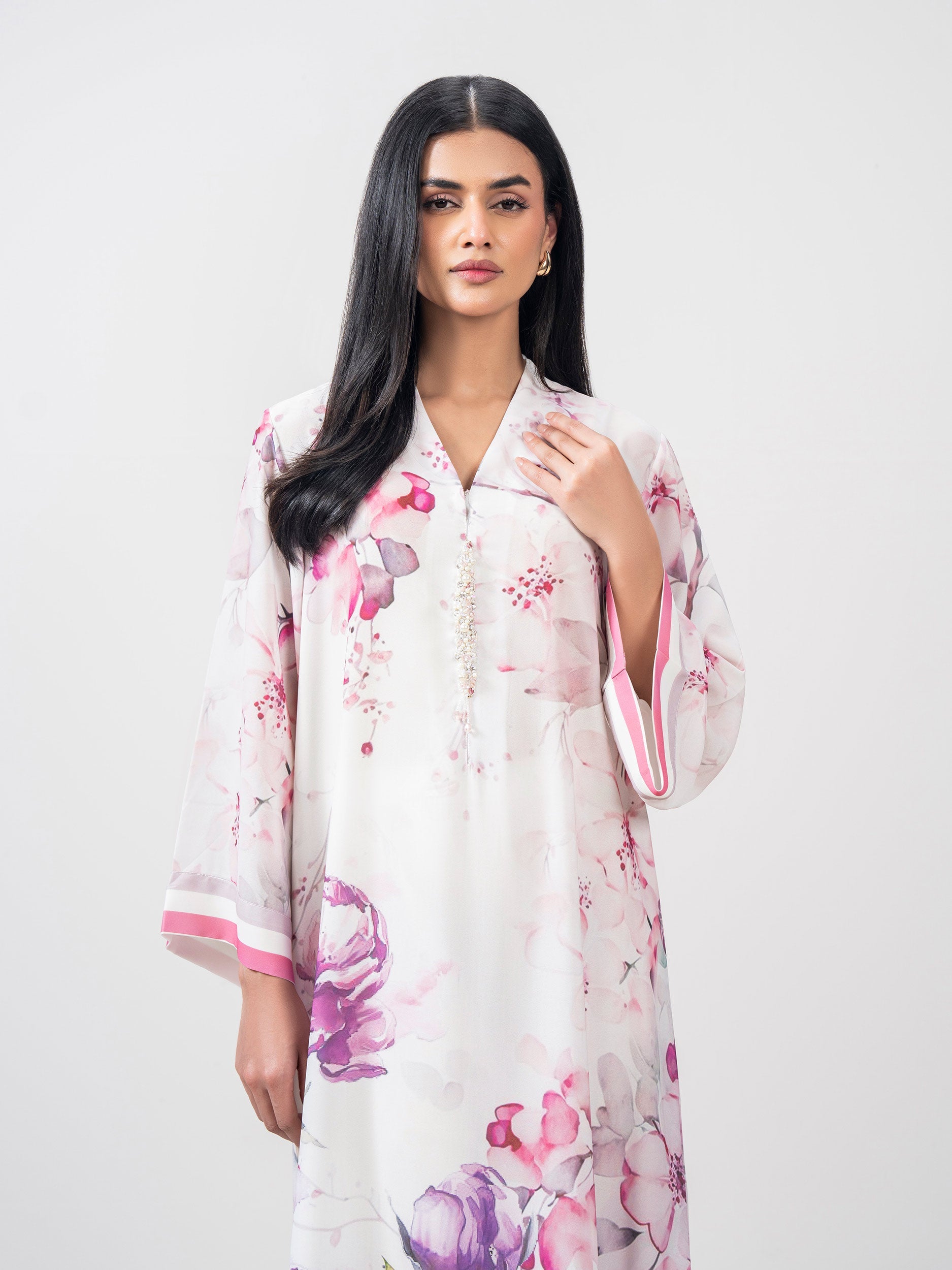 - Flowy asymmetric printed shirt with a V-neckline, embellished