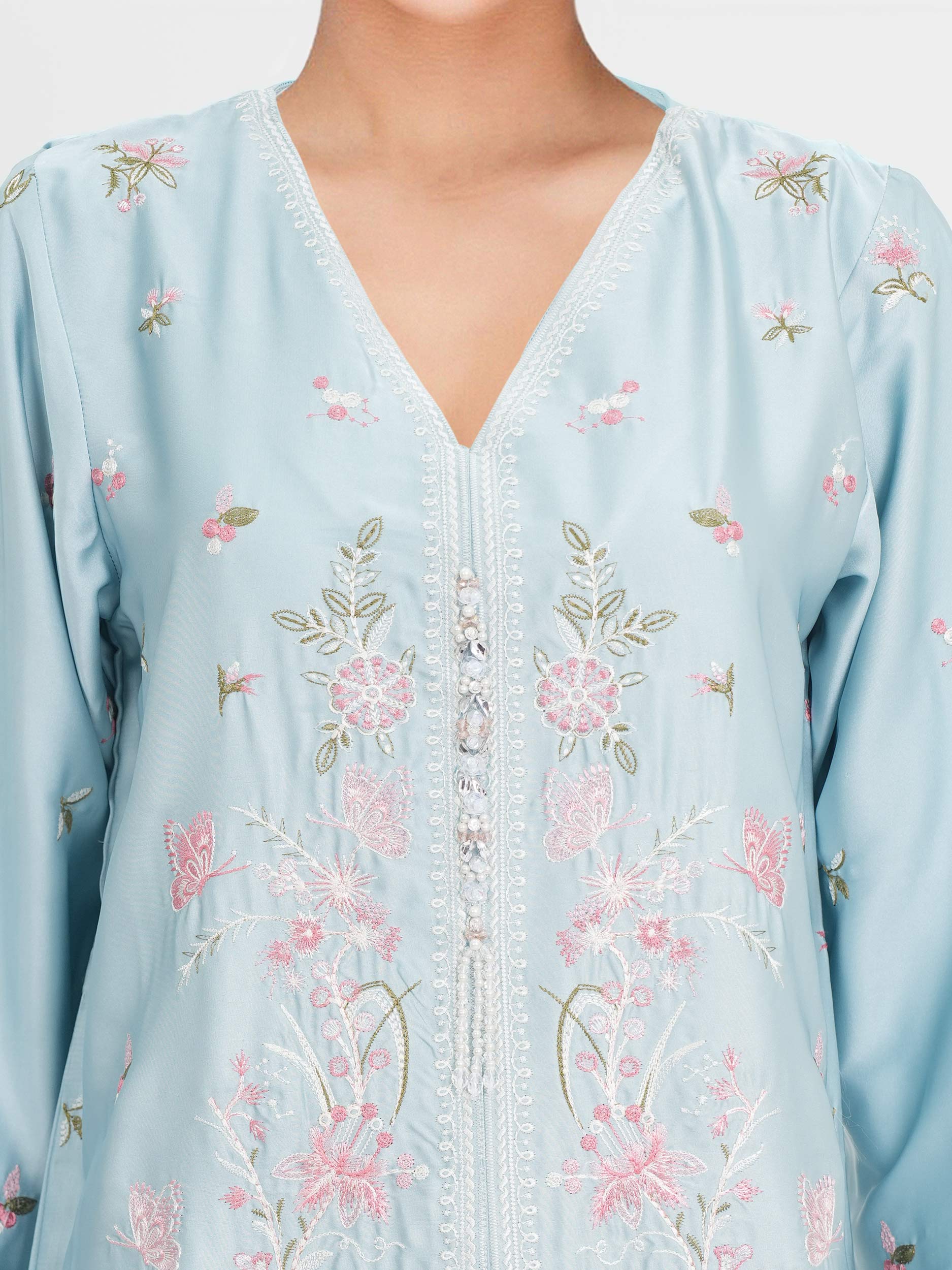 • Front-open embroidered shirt with a V-neckline