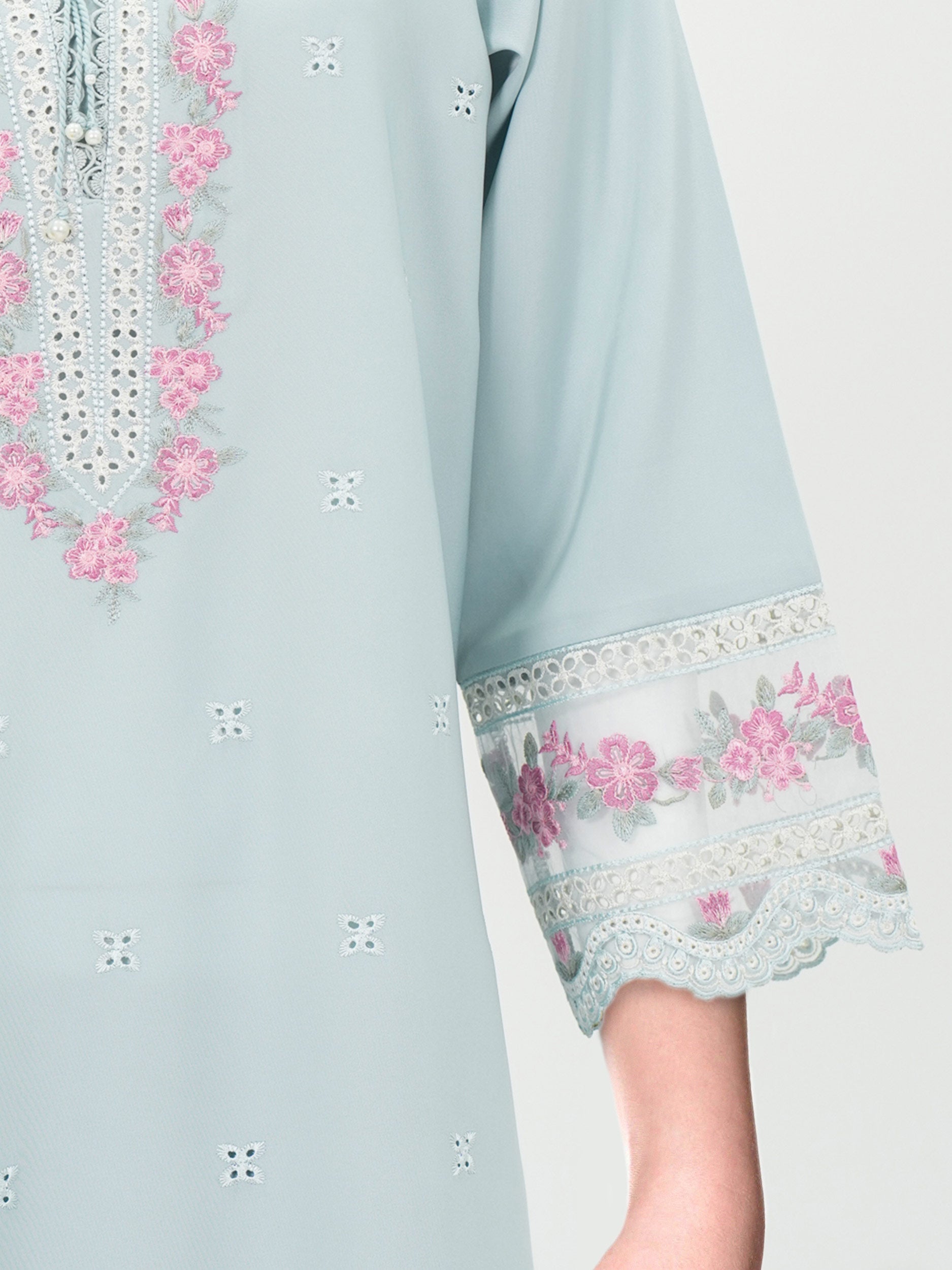- Long, flowy shirt with cut-dana embroidery, a round neckline, and flowy sleeves with