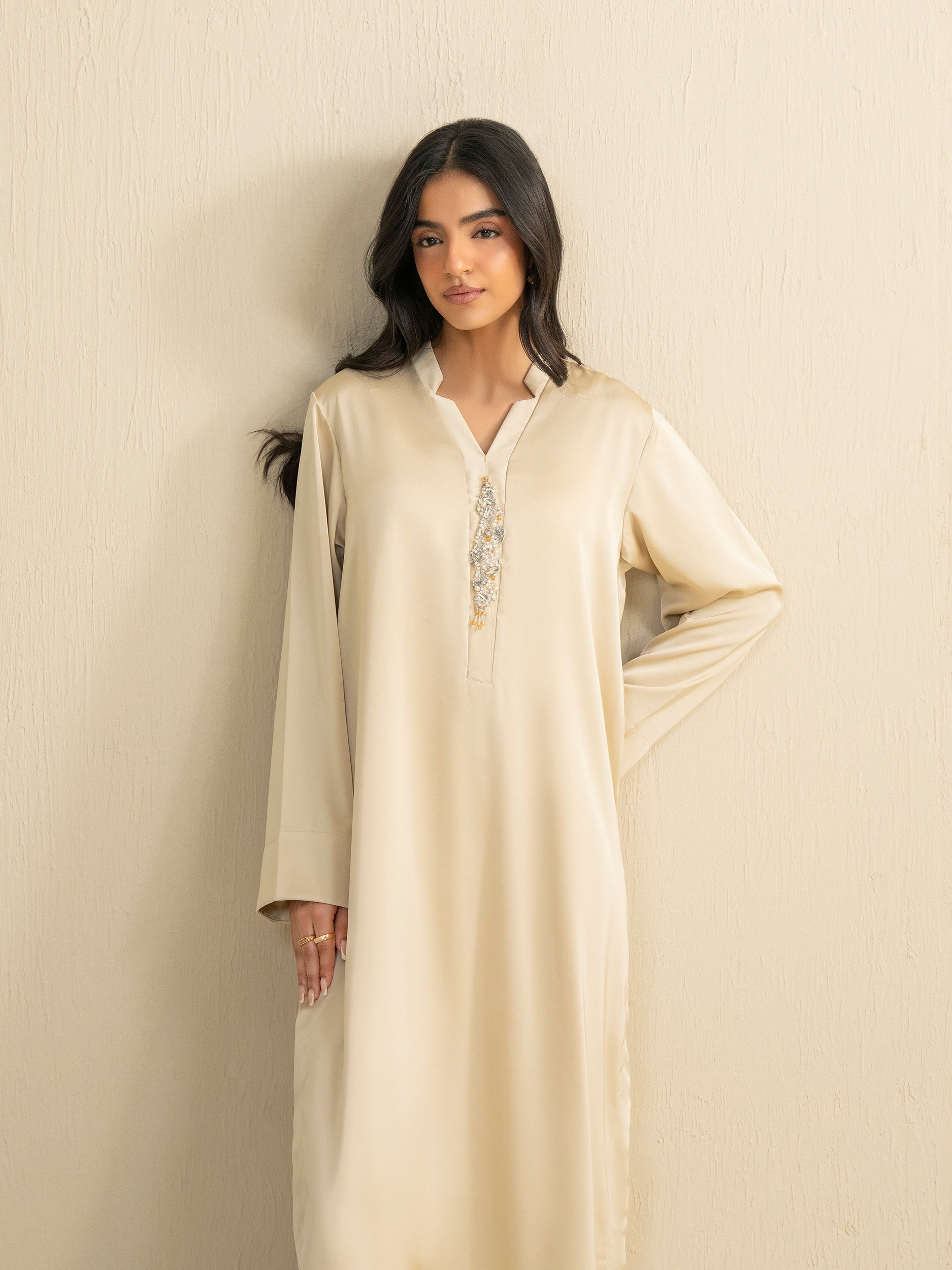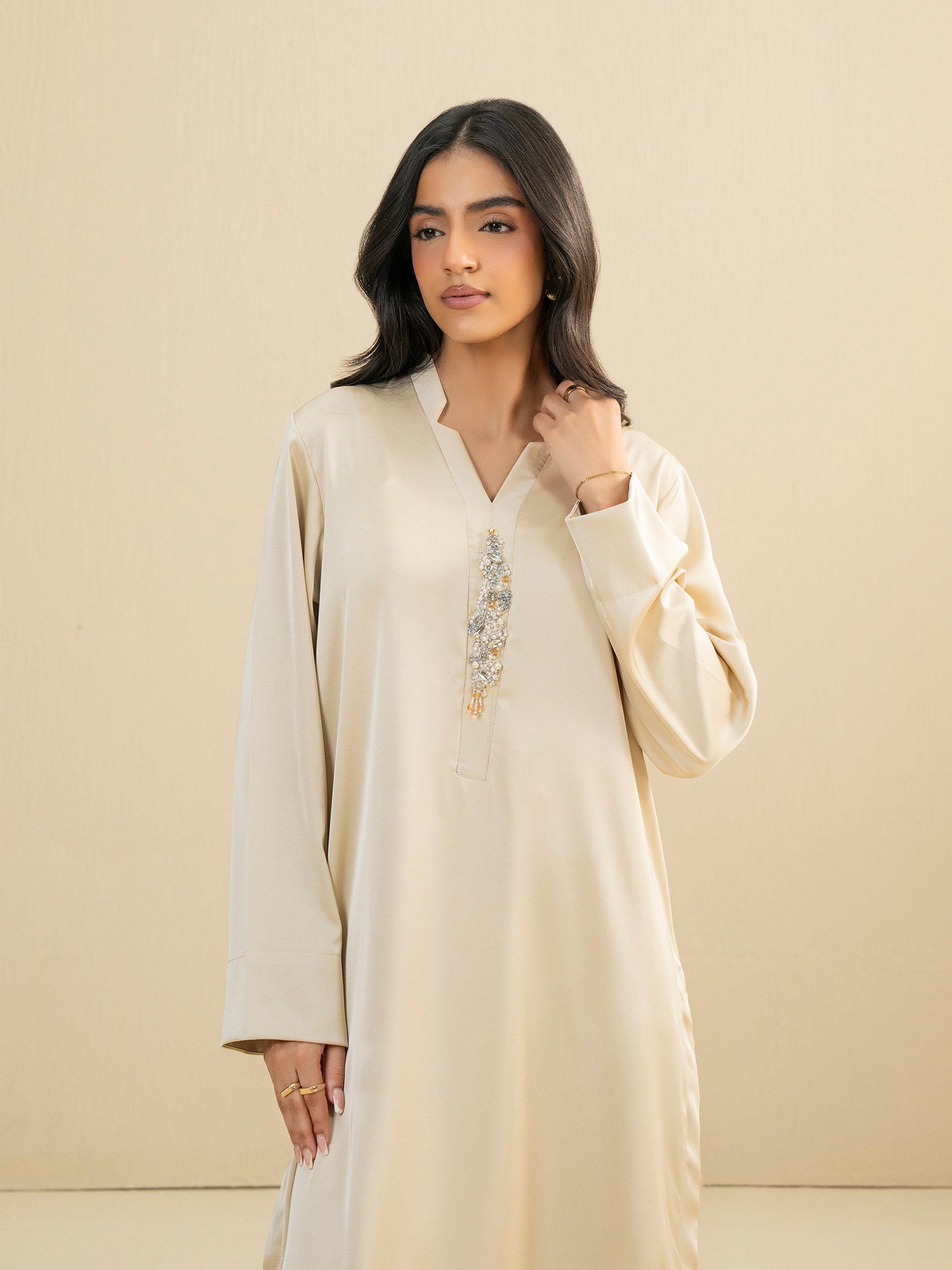 • Dyed shirt with pearl, beads and sequin embellishment on the