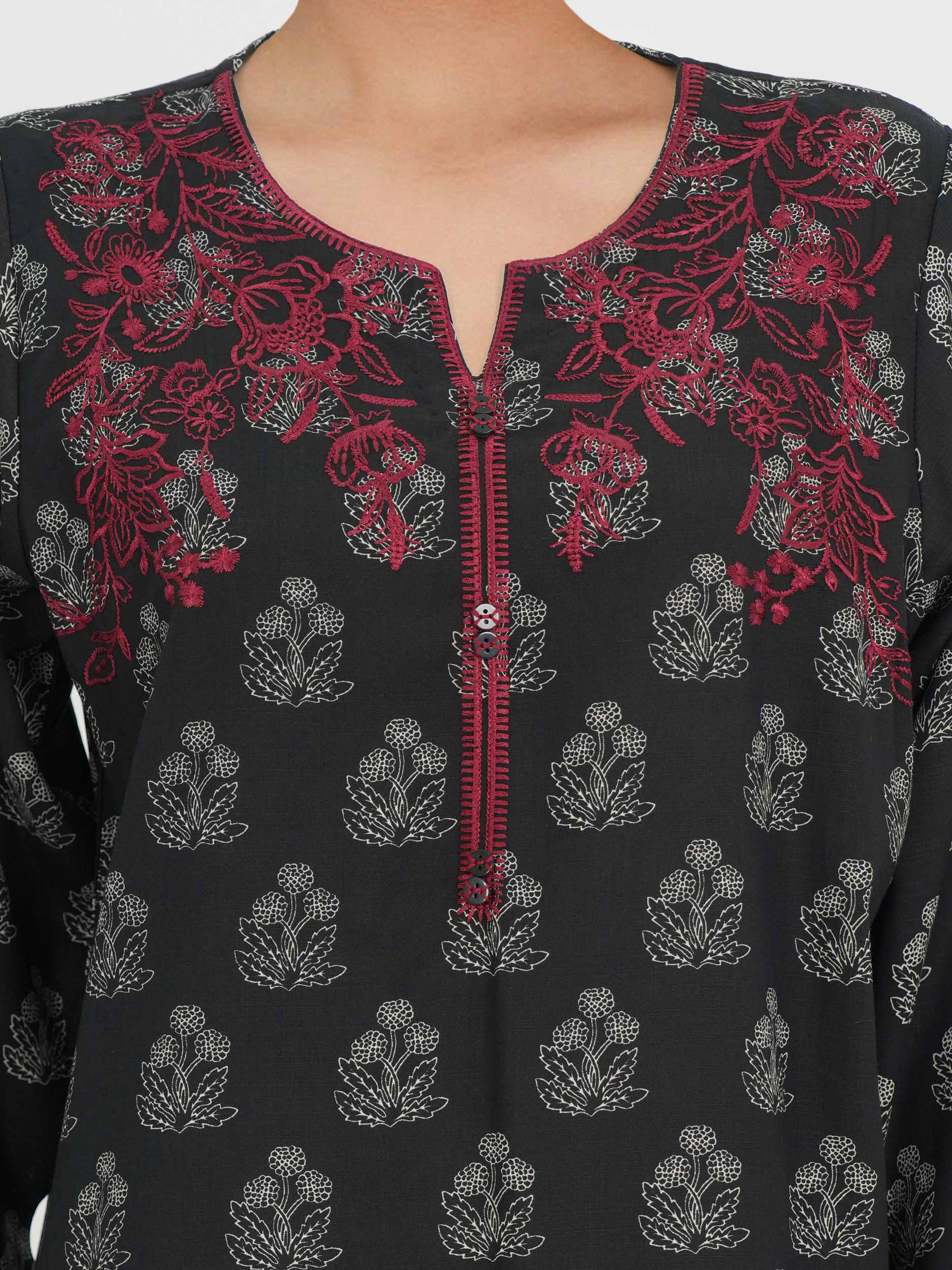 - Printed kurti with embroidered neckline and sleeve hems, and button detailed placket