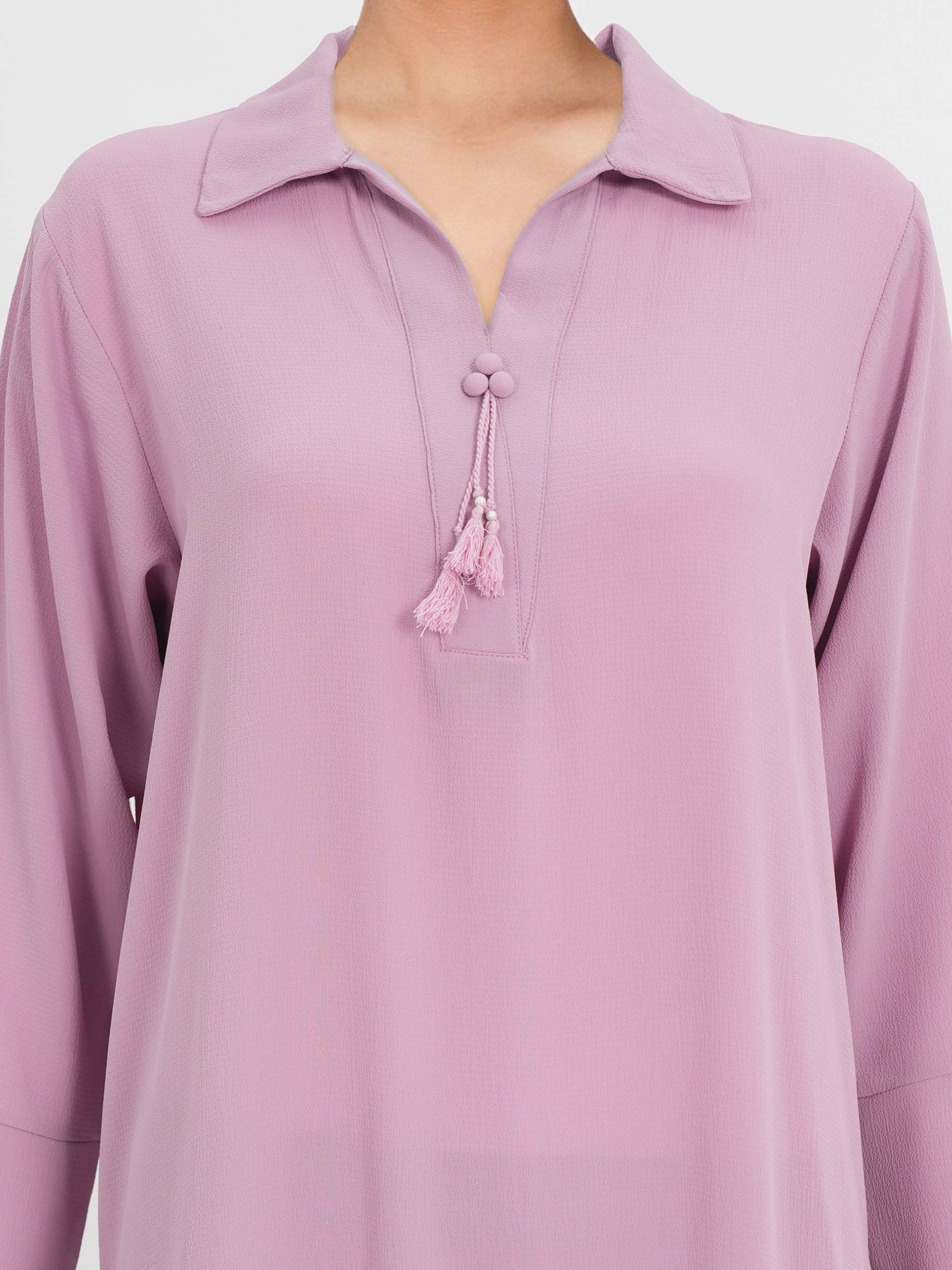 Solid straight-cut shirt with a collared neckline, tassel detailing, and flared sleeves with a cut