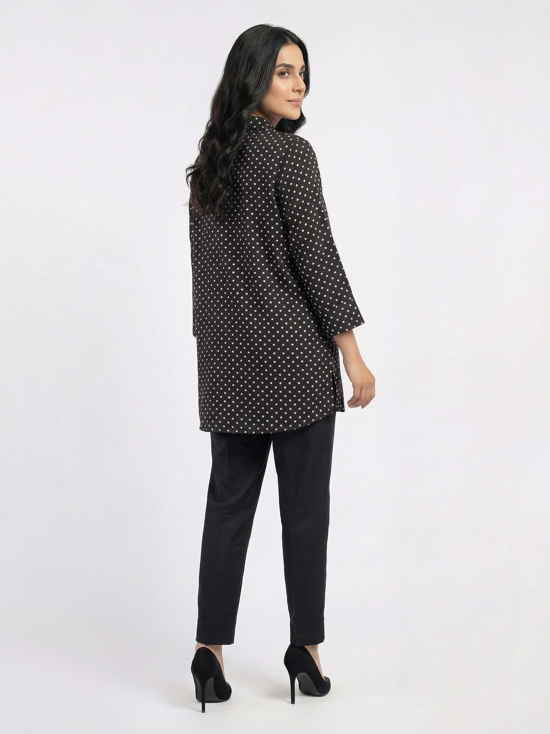 - Printed top with zip-up collared neckline and folded sleeves
